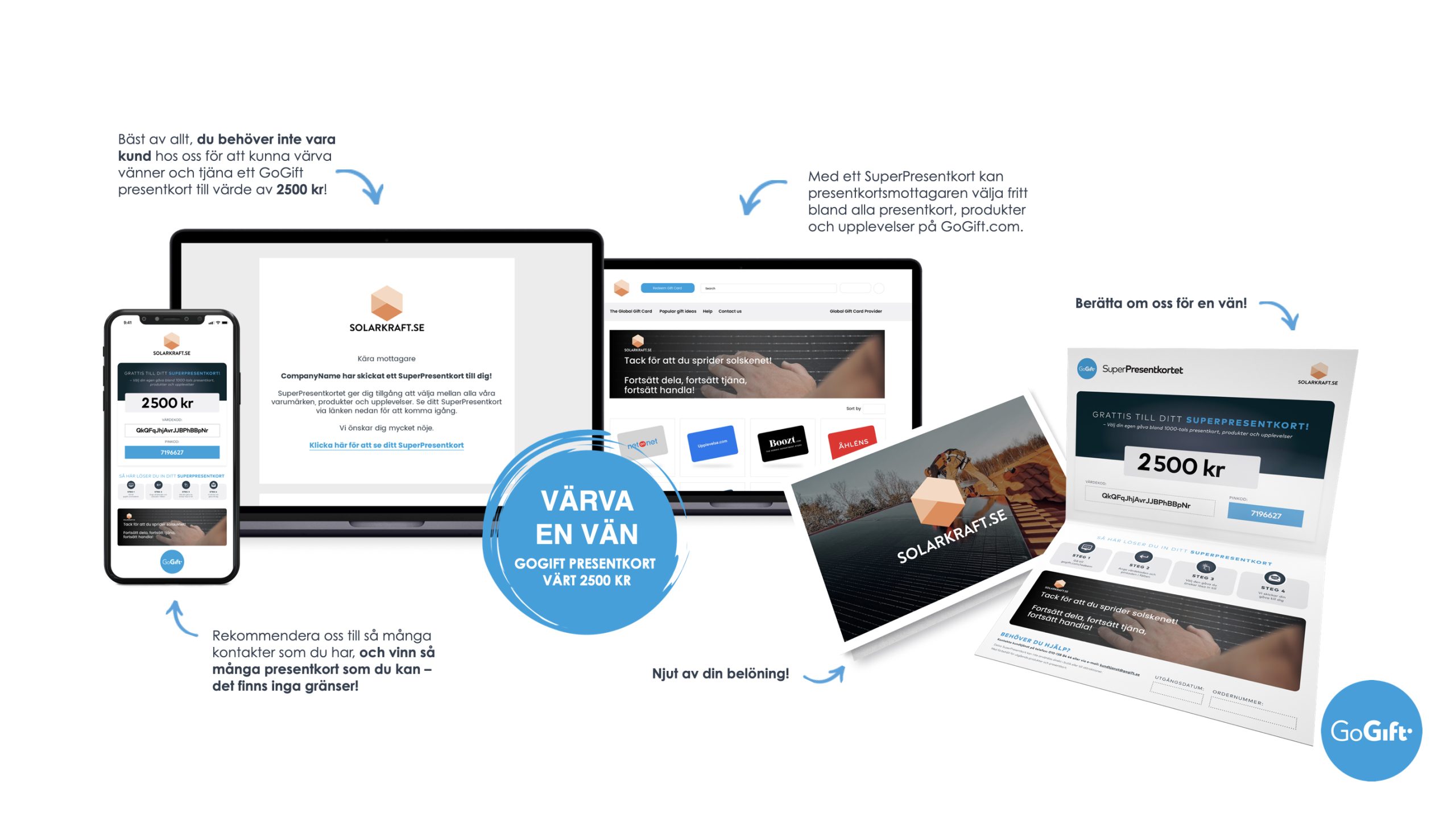 Du får ett GOGIFT PRESENTKORT VÄRT 2500 KR per värvning, när personen du värvar har fått sitt nya solcellssystem installerat, och även den personen kan sen rekommendera oss vidare och vi vinner en ny kund – win, win, win! Rekommendera oss till så många kontakter som du har, och få så många presentkort som du kan – det finns inga gränser!
